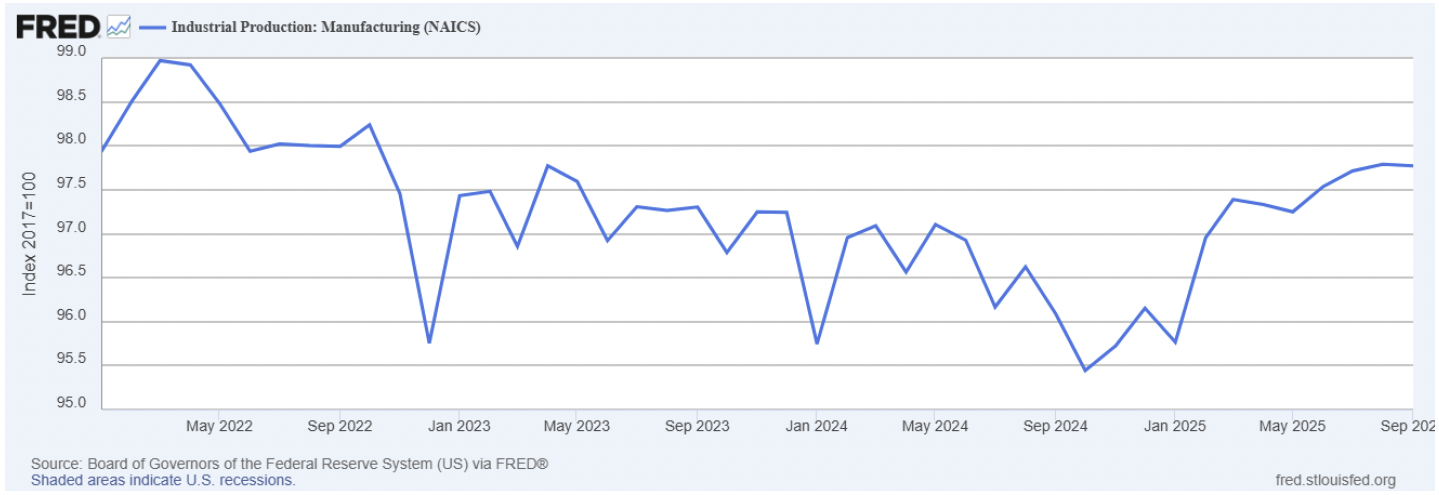 Consider the Atlanta Fed GDPNow economic forecast for U.S. real GDP for 2025 Q3, which is projecting 3% to 3.5% growth during the most recently completed quarter. No recession here.