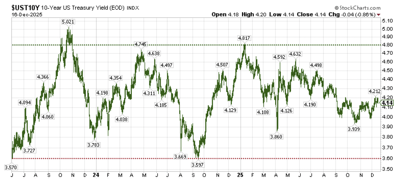 This highlights an important point about bonds as we move through the coming year. Bonds have been rangebound dating back to the start of the AI boom in the summer of 2023, moving back and forth in a range between 3.60% on the low side and 4.75% to 5.00% on the high side (important note: bond prices move inversely with yields – higher yields, lower bond prices; lower yields, higher bond prices). As shown in the chart above, we started 2025 with yields at or near the very high end of this range. And we are ending the year toward the lower end of the range, as the 10-year U.S. Treasury yield has been hard pressed to move sustainably below 4.00% for more than a year now. So while 2025 may have been a surprisingly good year for bonds, we should not be surprised if 2026 ends up being an unexpectedly disappointing year for bonds at they continue to travel back and forth in this trading channel, neutralized by easier monetary policy on the positive side being offset by persistent concerns about higher inflation on the negative side (inflation is the primary determinant of bond market returns – the outbreak of inflation in 2022 caused bonds to drop -13% that year, after all). Returns are likely to be positive overall for bonds thanks to the +4% coupon income being clipped, but total returns may be marginally less in the 2-4% range for the year when it’s all said and done. And if we do get an outbreak of inflation in 2026, all bets are off for bonds outside of short duration instruments.