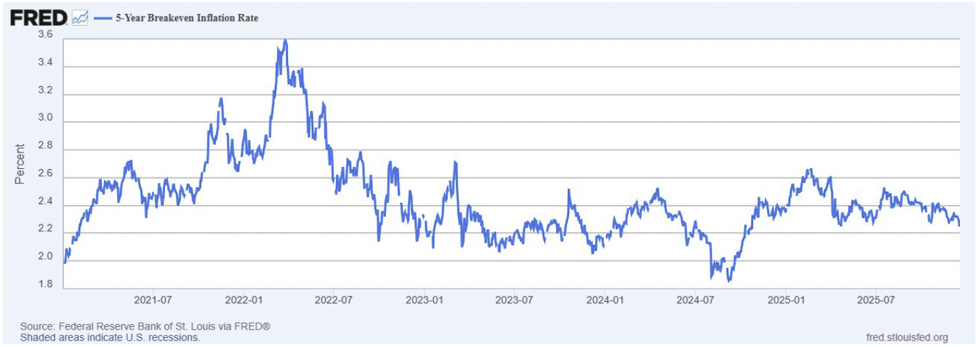 Fortunately, inflation pressures remain fully in check as 2025 is drawing to a close, as shown in the chart below, as average inflation over the next five years is fading toward 2% and seemingly becoming less of a concern for the market, not more.