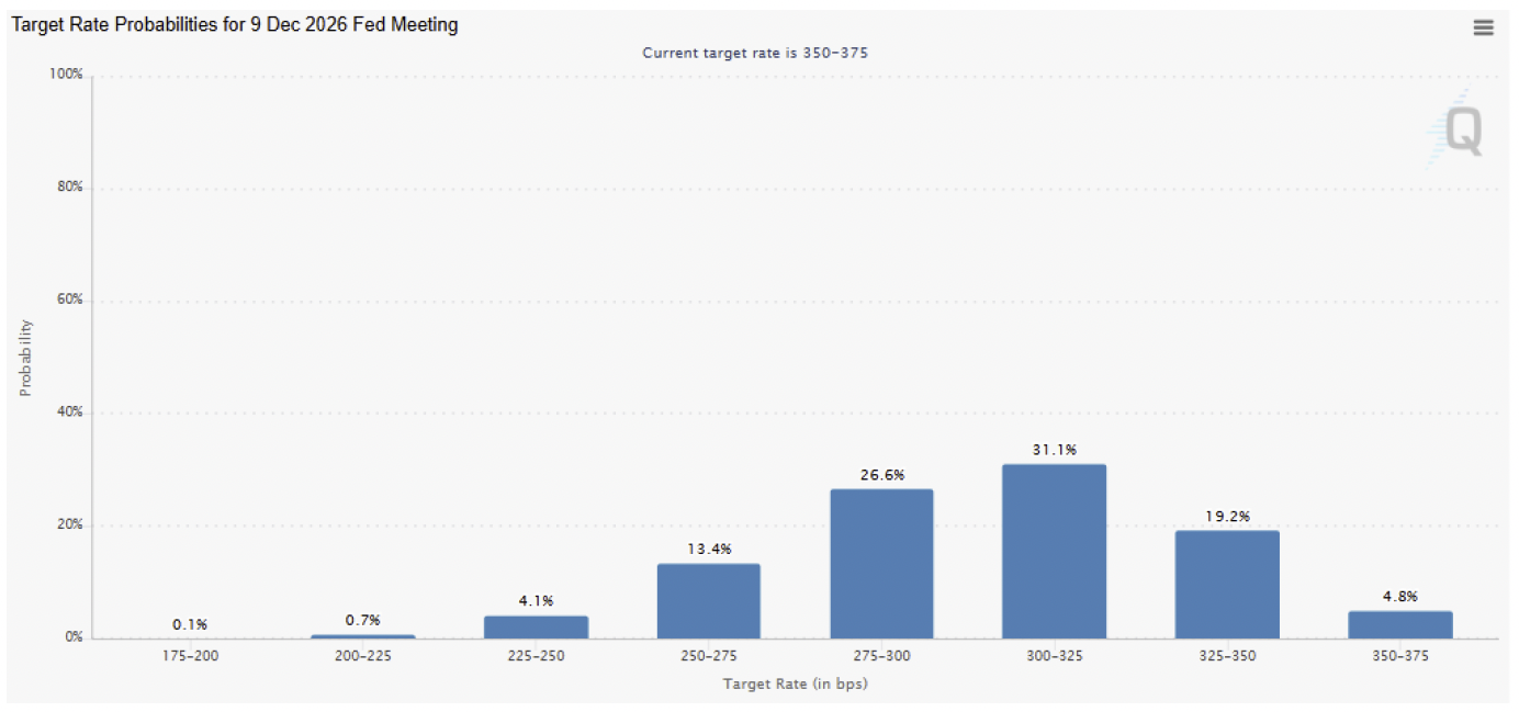 Market pricing supports this view. According to the CME FedWatch tool, futures currently imply two cuts next year, with a 31% probability the policy rate lands in the 3.00% – 3.25% range. The next highest probability is that of three cuts, bringing rates down to 2.75% – 3.00%. One cut ranks third, with a roughly 19% probability that we land in the 3.25% – 3.50% range.