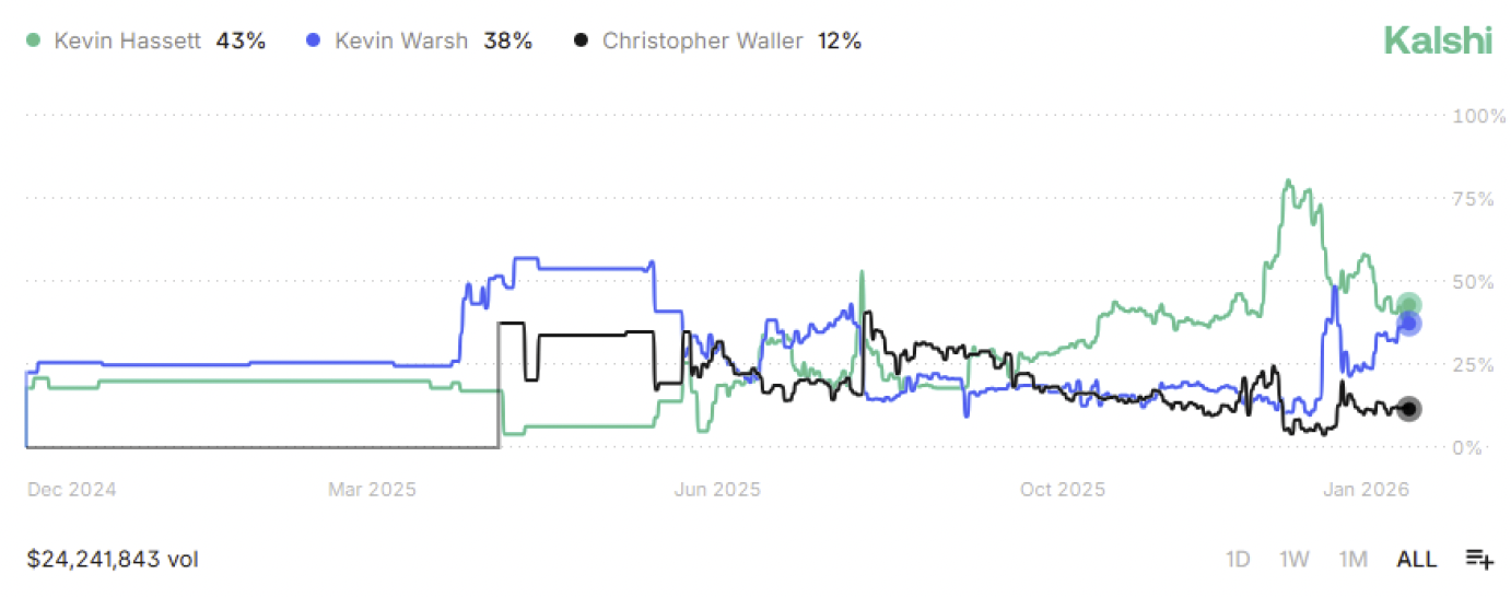 Shifting gears from markets to the macro lens, let’s start with what is effectively guaranteed at the Federal Reserve in 2026: a new Fed Chair. Jerome Powell’s final term as current Federal Reserve Chair will end in May 2026, and speculation around his successor has already become a focal point in financial media. President Trump is almost certain to nominate someone who broadly shares his views on the current interest rate environment and the state of the U.S. economy. The emerging list includes Fed Governors Chris Waller and Michelle Bowman, Former Fed Governor Kevin Warsh, and National Economic Council Director Kevin Hassett. At the time of writing, Kalshi’s prediction market assigns a 43% probability to Hassett becoming the nominee, making him the clear front runner based on current wagers.