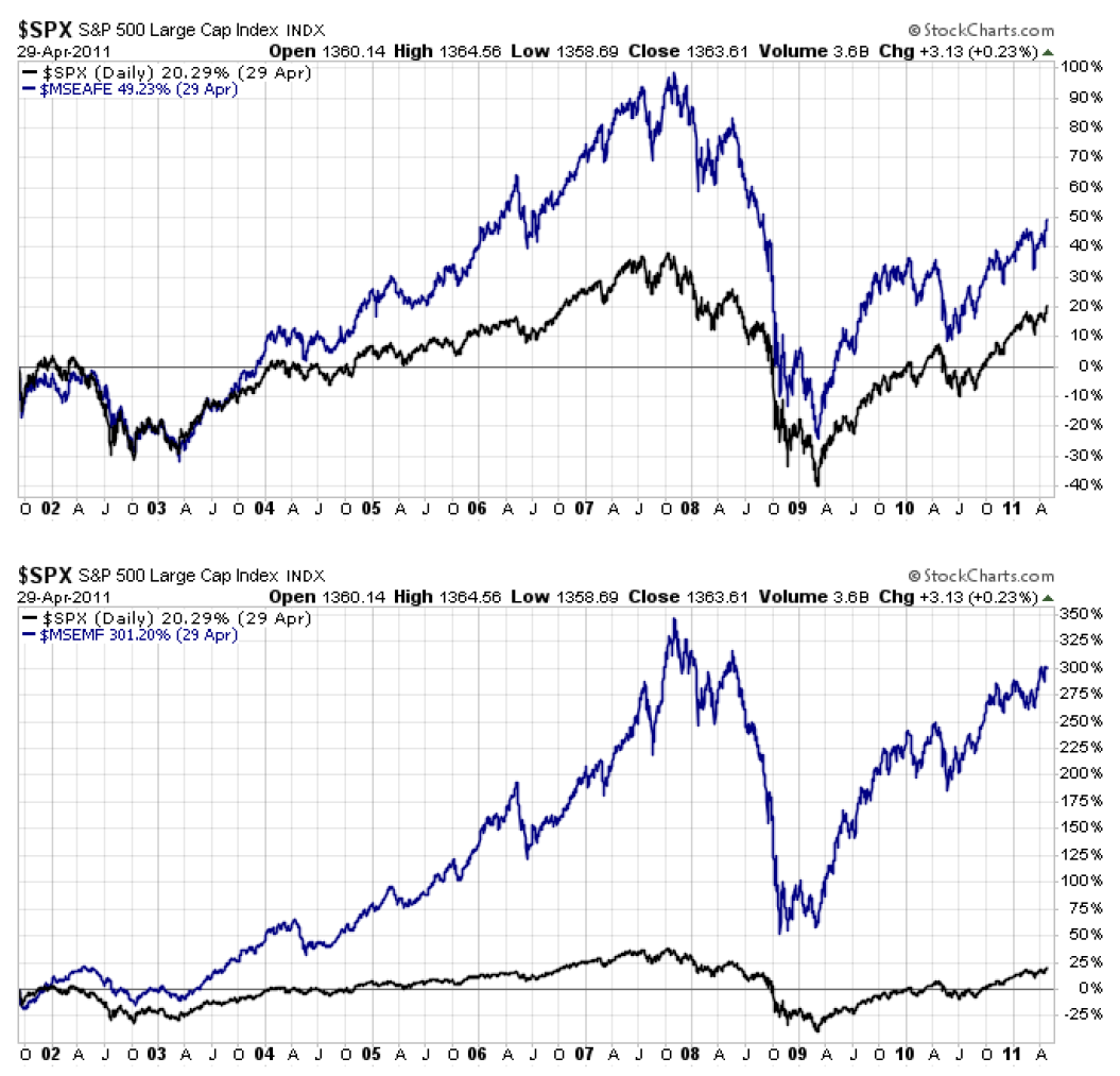 But just because investors have been thriving in U.S. markets for more than a decade does not mean that prior heroic returns from far-ranging markets around the world can simply be ignored. For example, consider the prior period from 2000 through early 2011 when both developed international and emerging markets trounced the U.S. for more than a decade.