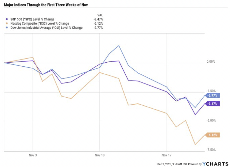 The November pullback was a natural reset for a market that had seen almost no volatility since early April. From April 8th to November 1st, equities moved singularly up and to the right, doing so with extreme concentration. The S&P 500 and Nasdaq each gained more than 30% from their April lows as investors piled into anything with an AI label attached to it. The momentum was relentless until the first three weeks of November when the combination of stretched valuations, profit taking, political noise, and fatigue in the AI trade finally broke the trend.