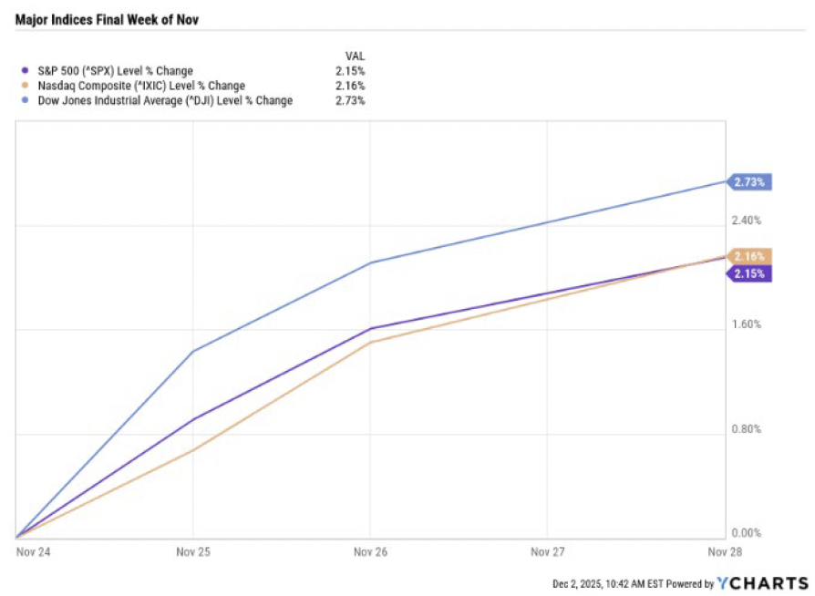 November gave equity investors whiplash. The first three weeks were a grind lower with all three major indices slipping more than 2.50%. The tech-heavy Nasdaq was down more than 6%, while the S&P slid almost 3.50%. Then Thanksgiving week hit and markets ripped higher with the Dow leading the charge up 2.73%. What looked like the start of the worst November since 2008 suddenly flipped into a setup for a classic holiday melt-up.