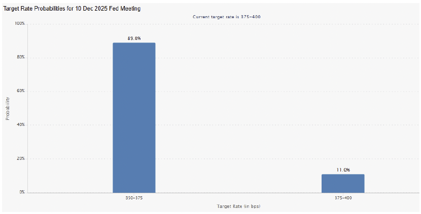 Markets are pricing a near 90% probability that the Fed cuts by another 25 basis points at next week’s meeting, yet their commentary hasn’t exactly been dovish. After the October meeting, Chair Jerome Powell struck a hawkish tone by stating that a December cut was “far from guaranteed”, and while several Fed governors have since leaned more openly toward supporting a cut, none have delivered the kind of dovish confirmation markets want.