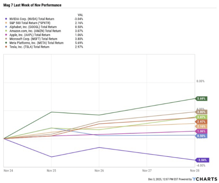 Market breadth complicates the picture but does not contradict it. Yes, participation broadened modestly during the Thanksgiving rally, but the top ten stocks in the S&P still make up roughly 35% of the index and Microsoft, Apple, Amazon, Meta, and Tesla contributed a disproportionate share of the late-November rebound. Did we see Nvidia and Google lag their peers? Yes, but they also had astronomical runs leading up to November and Alphabet happened to be an exception to the early November bleeding with shares up more than 14% over the last month. When breadth expands from very narrow levels, it often reflects laggards getting bought simply because managers cannot afford to miss the move.