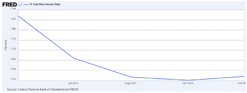 Real yields have eased materially. The 10-year real yield is down from its late summer highs, reducing the discount rate applied to future earnings. Lower real yields provide a mechanical boost to equity valuations and help to justify the markets move.